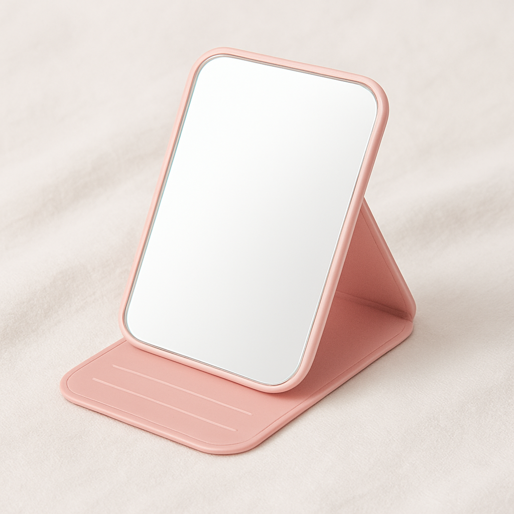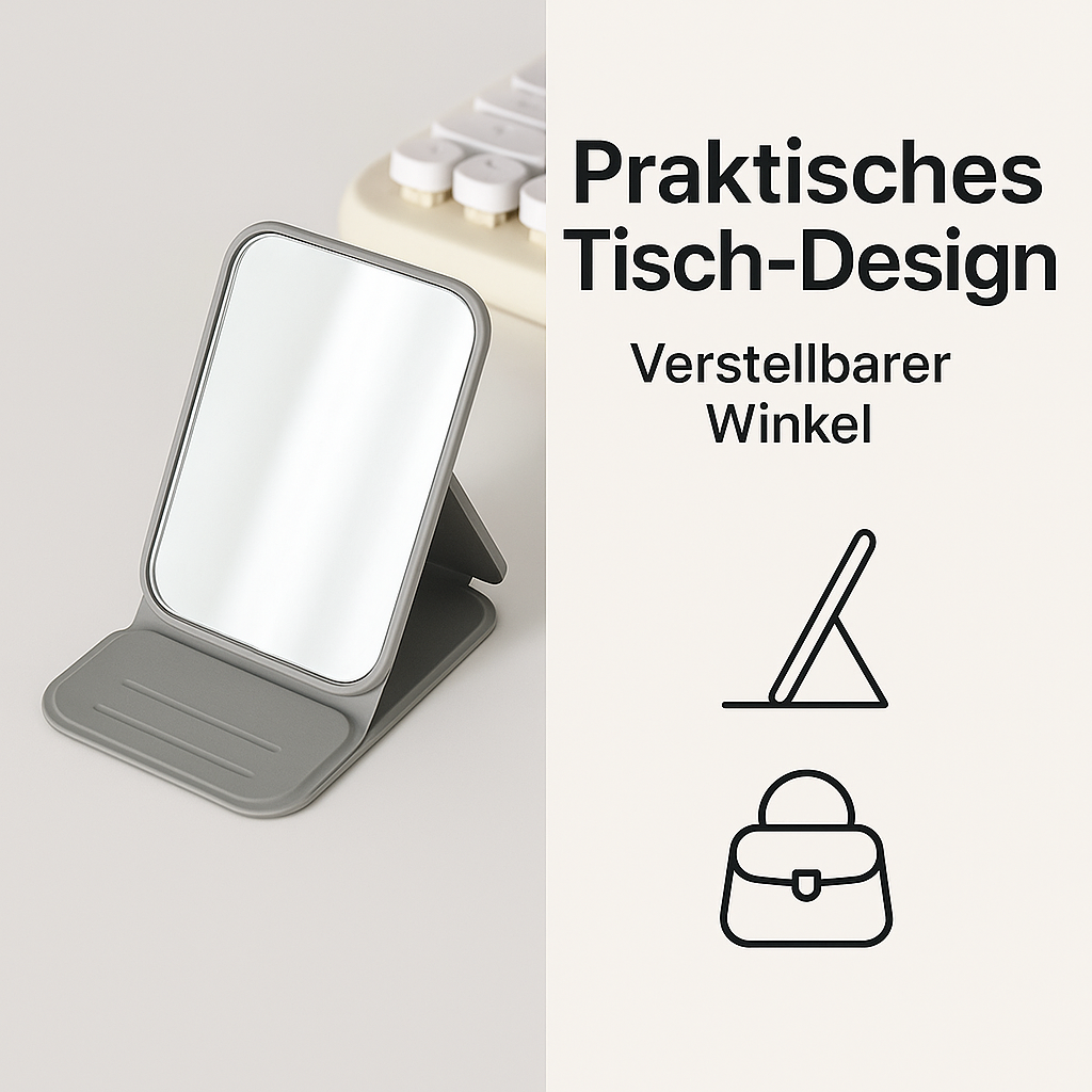 Der Spiegel lässt sich dank seiner cleveren 3-Stufen-Rille im perfekten Winkel aufstellen – egal ob du Lippenpflege aufträgst, Mascara kontrollierst oder einfach schauen willst, ob noch alles sitzt.